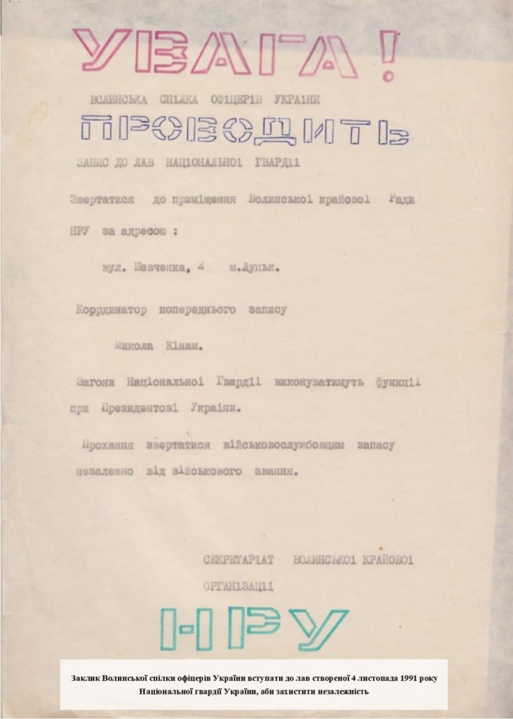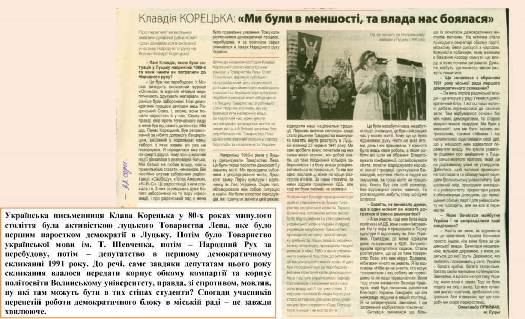 Тож вашій увазі – історичні фото, окремі випуски першої демократичної преси на Волині, а також уривки з книги Івана Корсака «Оксамит нездавнених літ», де публікуються спогади волинян – учасників періоду проголошення незалежності України Клави Корецької, Віктора Вербича та Івана Корсака.
