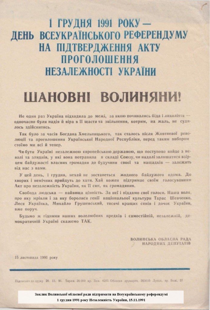 Волинська область також долучається до марафону, поширюючи матеріали про історичні події, пов’язані з проголошенням незалежності України та її утвердженням на Волині. Переглянувши запропоновані матеріали, ви дізнаєтесь, зокрема, як на Волині відроджувалась національна культура, релігія та духовність, як зароджувалась демократична преса та утверджувалась українська символіка.