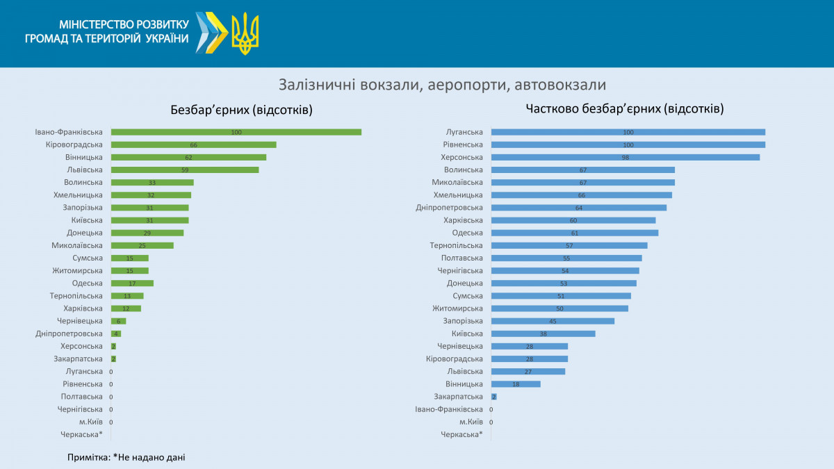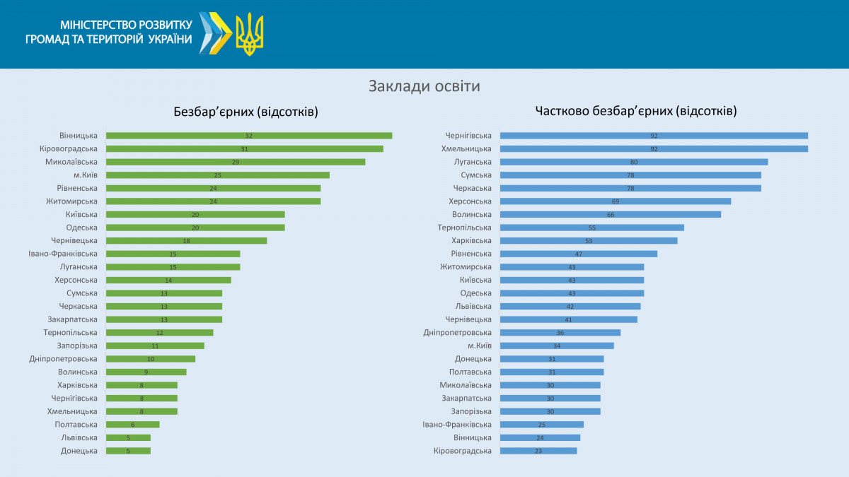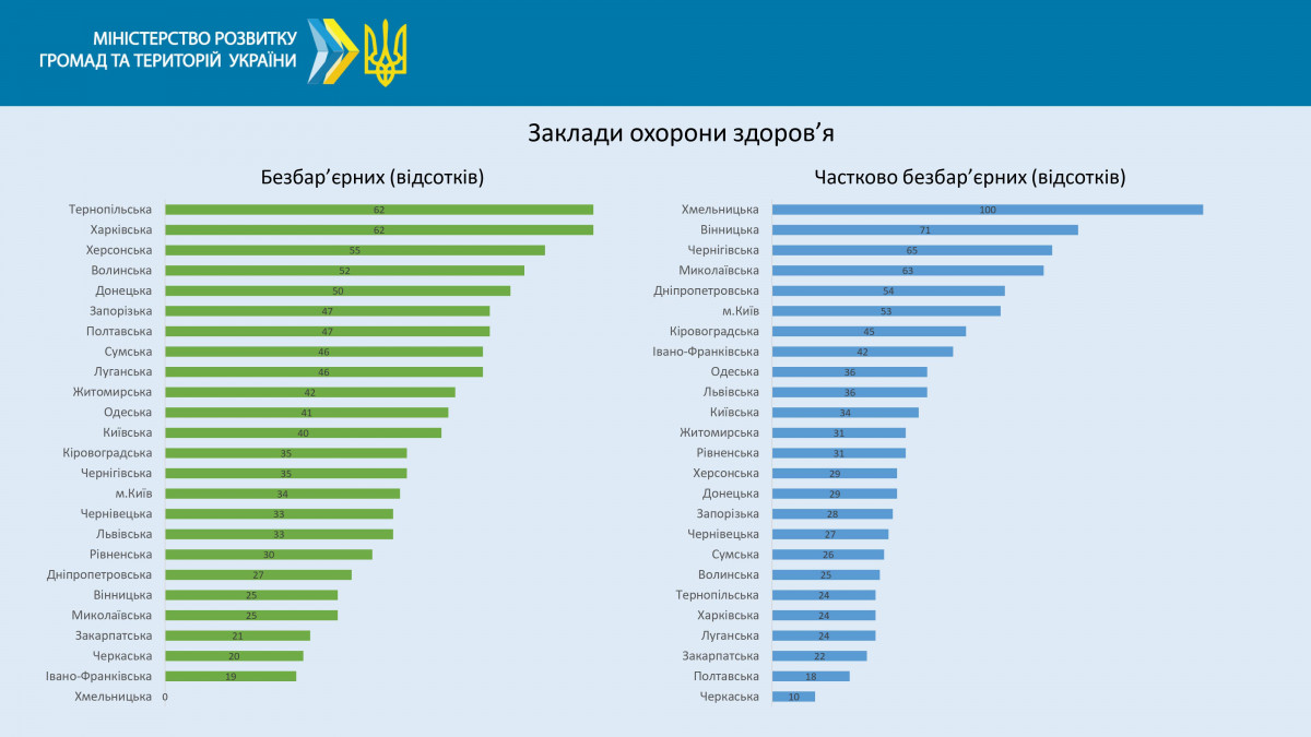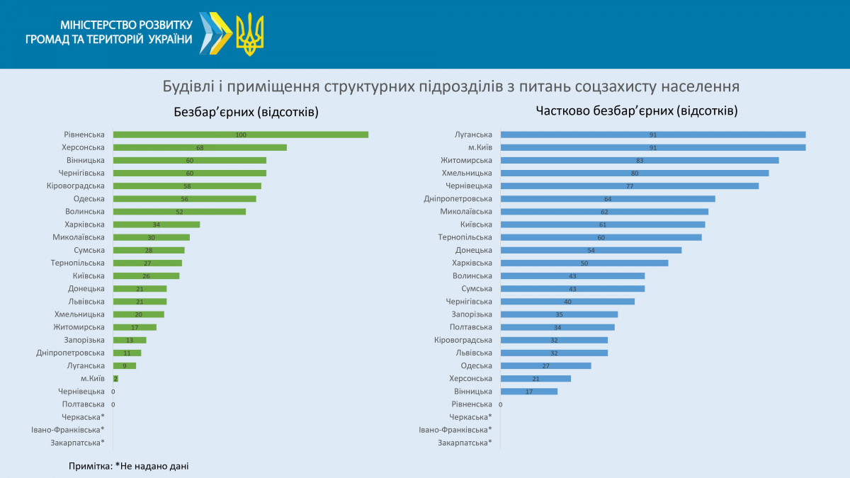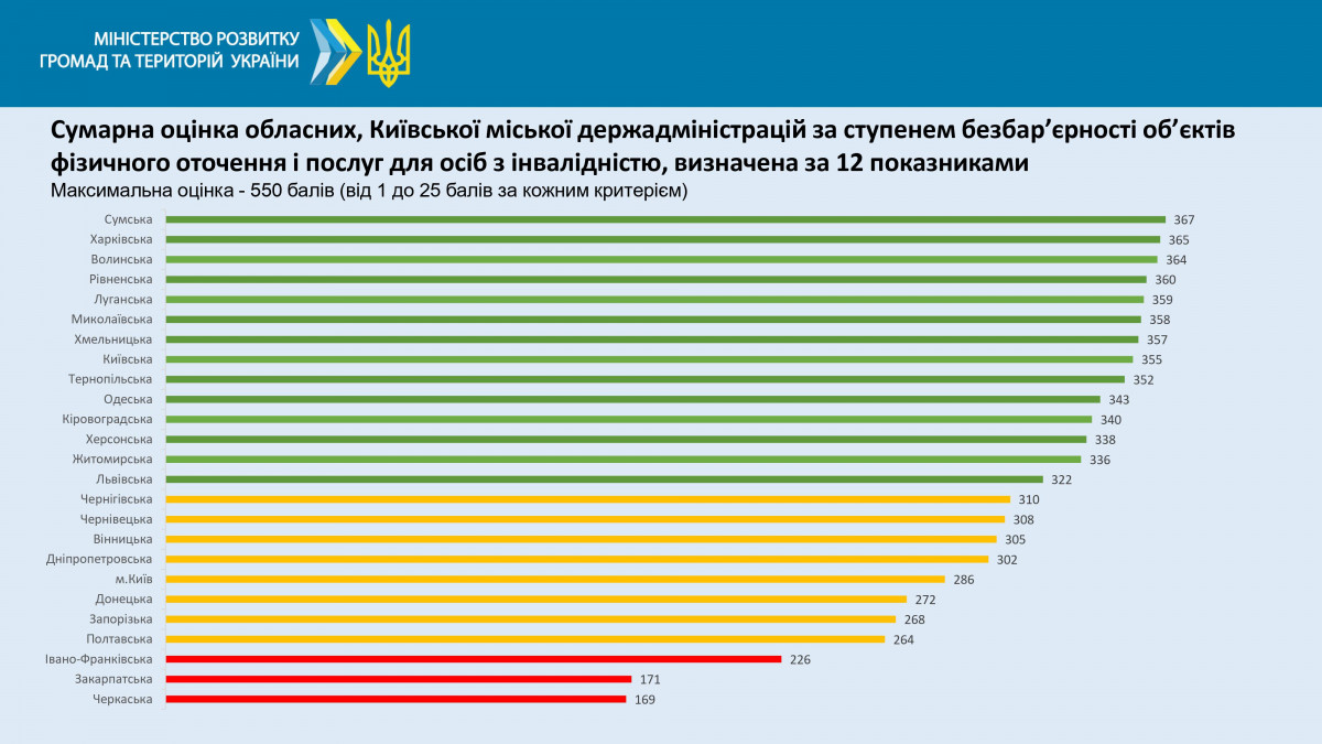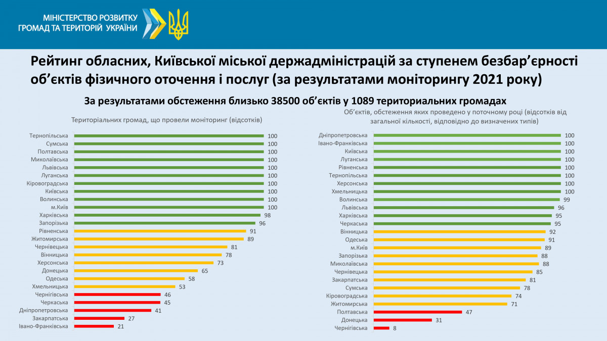 Міністерство розвитку громад та територій України за результатами моніторингу 2021 року провело рейтинг обласних, Київської міської держадміністрацій за ступенем безбар’єрності об’єктів фізичного оточення і послуг.