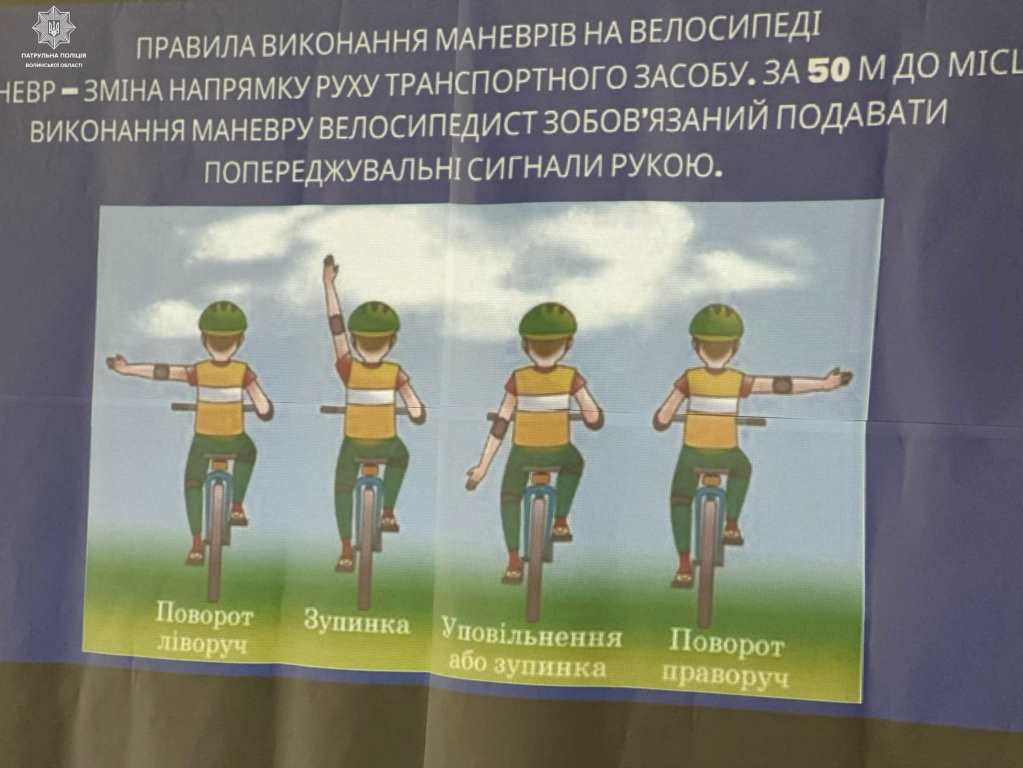 Інспектори також продемонстрували, як під час руху проїзною частиною, перед зупинкою, перестроюванням, поворотом або розворотом велосипедисти зобовʼязані подавати попереджувальні сигнали рукою.