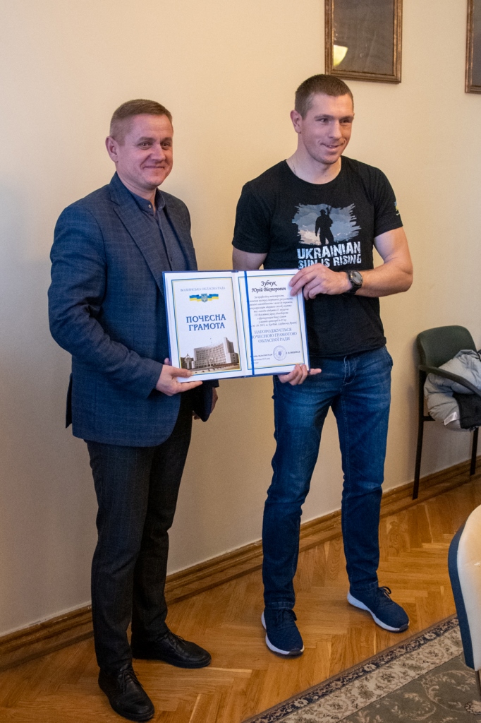 «Війна не зупинила наших чемпіонів, попри усі складнощі та перестороги вони продовжують тренуватися, досягати нових висот і прославляти нашу державу у світі. Разом із тим, свою міць волинські спортсмени сьогодні доводять не лише на змаганнях, але й на фронті. Мені надзвичайно приємно вручити відзнаку саме Юрію Зубчуку, який просто з окопу піднявся на п’єдестал, та його тренеру Віталію Тимофєєву, який також став на захист країни і сьогодні перебуває на передовій. Це свідчить про те, що завдяки таким мужнім хлопцям, українська нація є незборима та непереможна», – наголосив він.