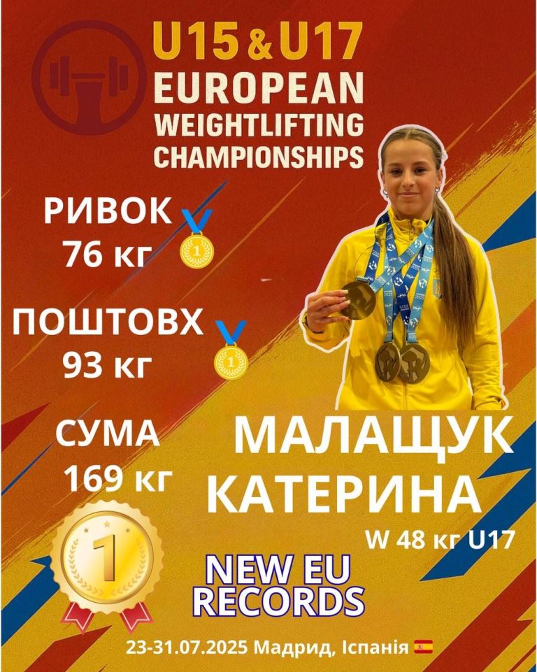 Майстер спорту України міжнародного класу Катерина Малащук із Камінь-Каширщини стала абсолютною чемпіонкою Європи з важкої атлетики U17 у ваговій категорії до 48 кг, встановивши нові рекорди.