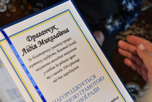 За багаторічну сумлінну працю, багатий досвід, виховання молодого покоління у любові до рідного краю та з нагоди 104-ї річниці від дня народження Григорій Пустовіт нагородив Лідію Драганчук Почесною грамотою обласної ради, а представники місцевої влади вручили їй подарунки.