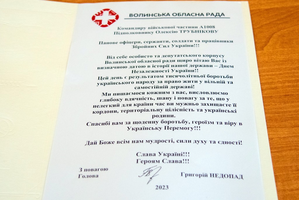 Окрім цінних подарунків на Харківський напрямок, де нині дислокується князівська бригада, для командування та усіх бійців військової частини, прямує й вітальна адреса за підписом голови обласної ради, а також патріотичні малюнки, які підготували і передали воїнам вихованці Затурцівської спеціальної школи. Нагадаємо, що з початку повномасштабного вторгнення і дотепер малеча перебуває у Люблінському воєводстві Польщі, під опікою Фундації «Честь Допомоги Дітям», яке очолює великий друг Волині, меценат і благодійник Пйотр Зигарскі.