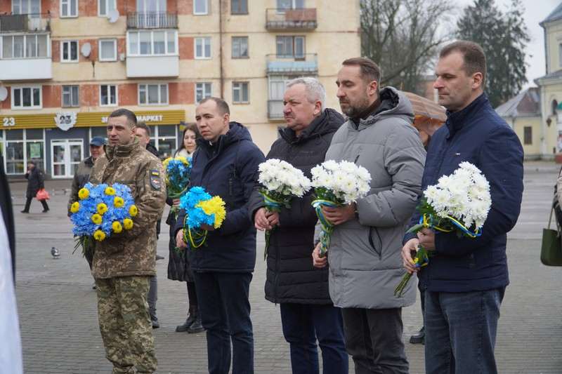 Після короткого богослужіння відбулось покладання квітів до дошки пам’яті, у якому взяли участь міський голова Ігор Пальонка, його перший заступник Ярослав Матвійчук, очільники РВА Юрій Лобач і районної ради Віктор Хиць, представники громад Володимирщини та військовослужбовці Князівської бригади.