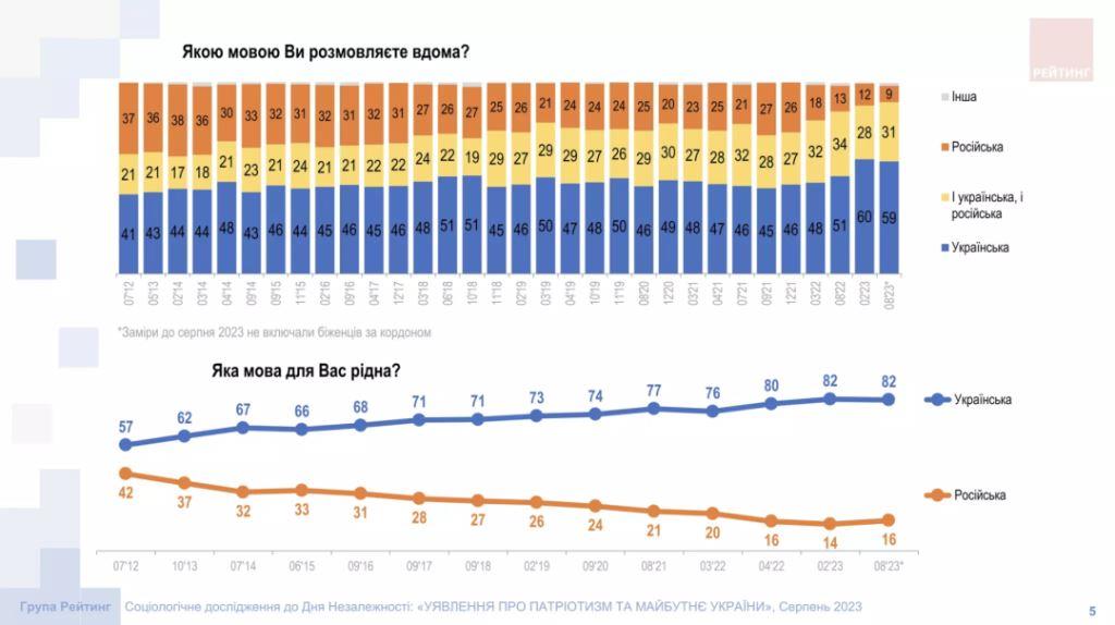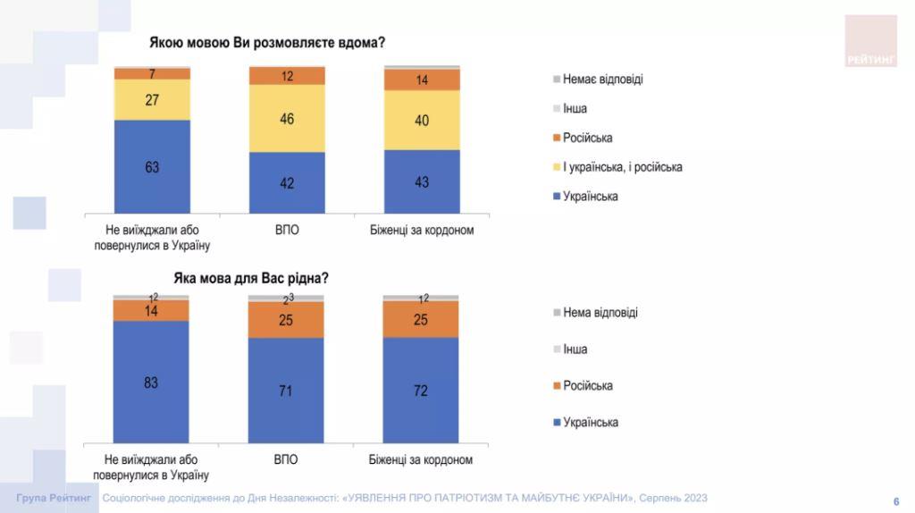 Як зазначається, починаючи з березня 2022 року помітно зменшується використання російської мови у побуті. Для 82 % опитаних українська мова є рідною, для 16 % такою є російська. ВПО і біженці, які перебувають за кордоном, частіше використовують обидві мови для спілкування або говорять російською. Тим не менше, понад 70 % ВПО і біженців вважають рідною українську.