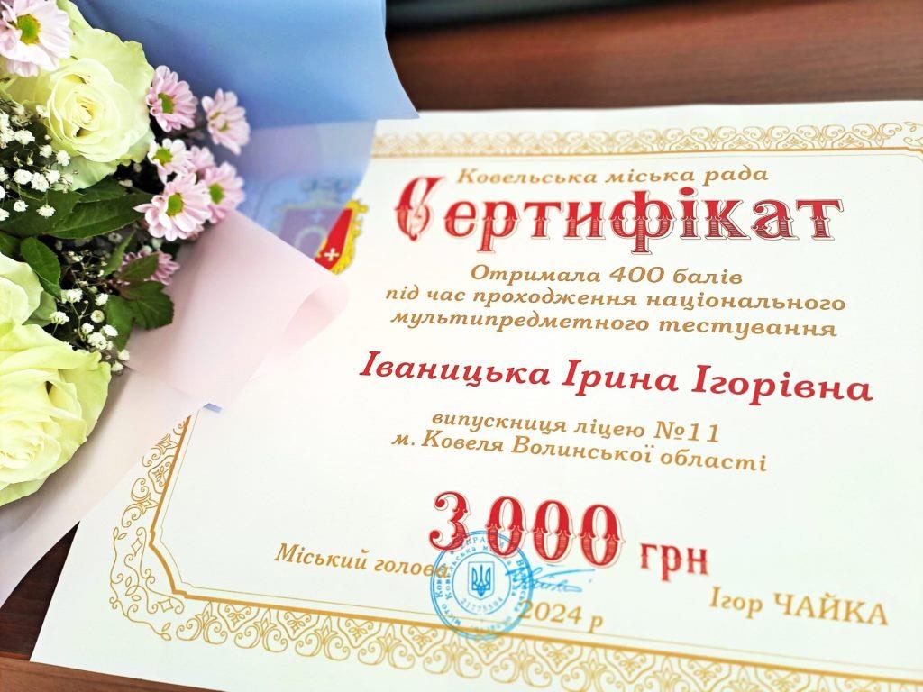 Випускниці ковельського ліцею, яка отримала 400 балів з НМТ, вручили заслужену нагороду