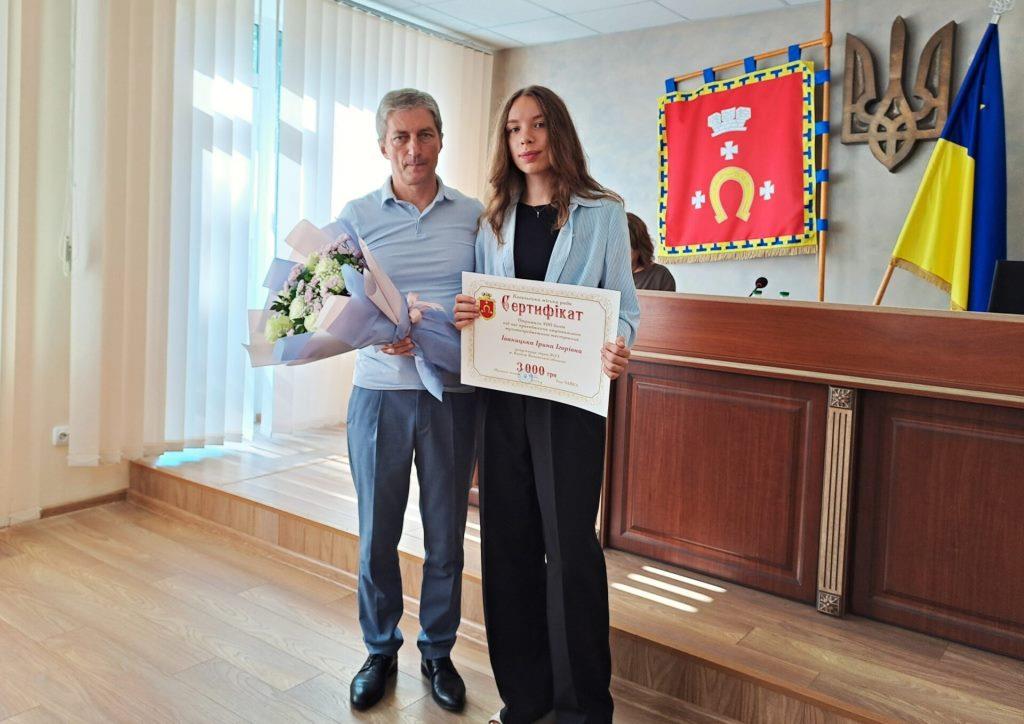 Учора, 21 серпня, на початку сесії міський голова Ігор Чайка вручив сертифікат на три тисячі гривень випускниці ліцею № 11 Ірині Іваницькій.