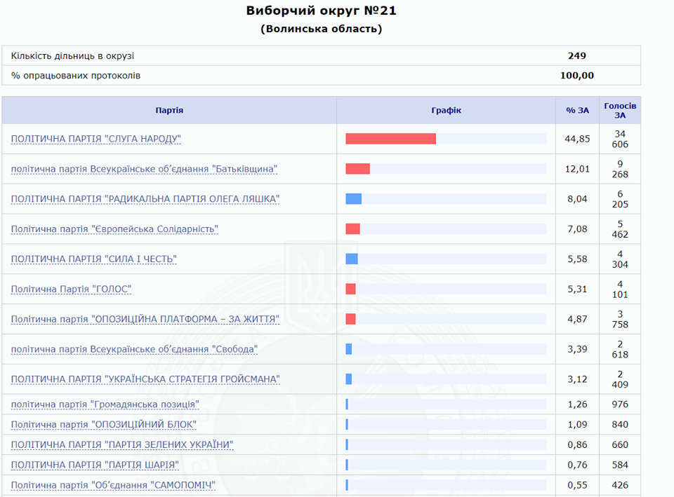 В окрузі № 21 шість партій подолали п’ятивідсотковий бар’єр.