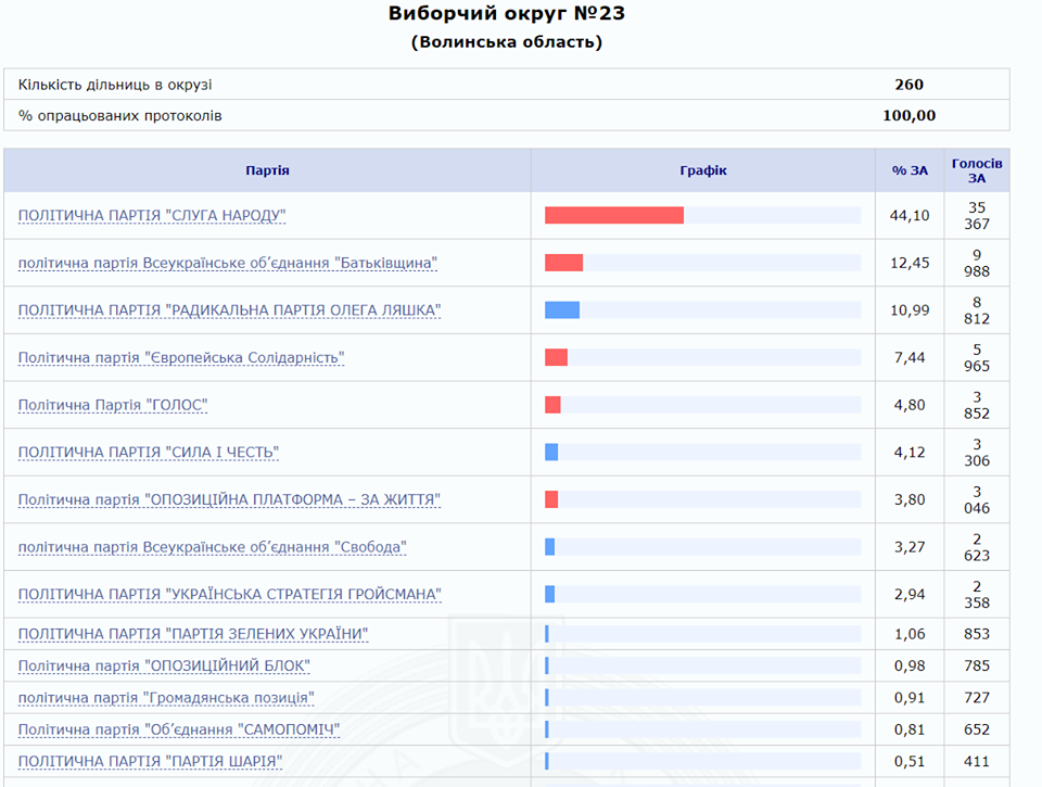За партію “Слуга народу” віддали свій голос 44,1 % виборців, за ВО “Батьківщина” — 12,45 %, за “Радикальну партію Олега Ляшка — 10,99 % та за “Європейську Солідарність” — 7,44 %.