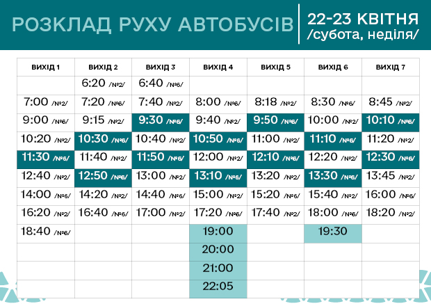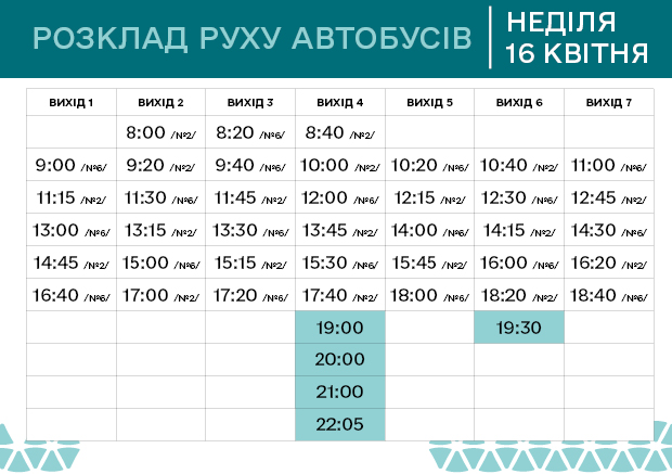 16 квітня (на Великдень) та 22 і 23 квітня (на проводи) автобуси № 2 та № 6 будуть курсувати за зміненими графіками.