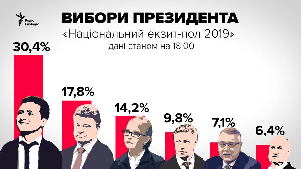 Нагадаємо, що за станом на 18.00 Володимир Зеленський здобуває 30,4%, Петро Порошенко – 17,8%, Юлія Тимошенко – 14,2%, Юрій Бойко – 9,8%, Анатолій Гриценко – 7,1%, Ігор Смешко – 6,4%, Олег Ляшко – 4,8%, Олександр Вілкул – 4,0%, Руслан Кошулинський – 1,8%. Решта кандидатів здобули менше 1%.