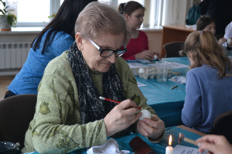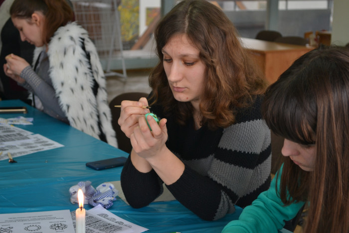 Учасники майстер-класу уважно слухали поради й застосовували їх на практиці. Кожен міг скористатися певним шаблоном розпису, або ж придумати власний дизайн писанки.
