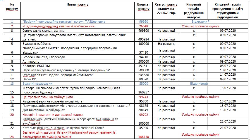У Володимирі-Волинському виконавці здійснили перевірку шести проектів Громадського бюджету 2021, з яких чотири проекти успішно пройшли оцінку та два були відхилені.