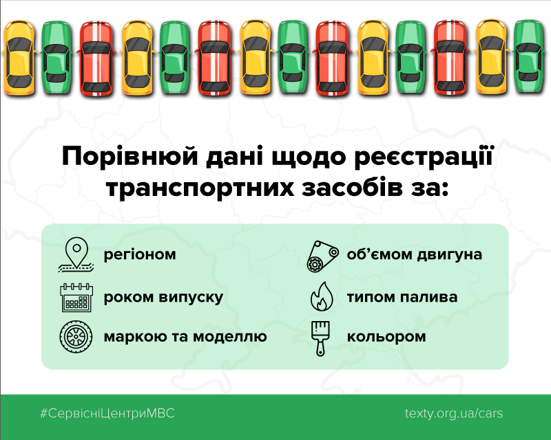 Вперше в Україні Головний сервісний центр МВС оприлюднив відкриті дані про реєстрацію транспортних засобів на національному порталі data.gov.ua. На основі відкритих даних Єдиного державного реєстру МВС стосовно зареєстрованих транспортних засобів та їх власників створено онлайн сервіс про першу реєстрацію авто (texty.org.ua/cars), що надає змогу кожному громадянину самостійно отримати інформацію про автомобільний ринок у кілька кліків.