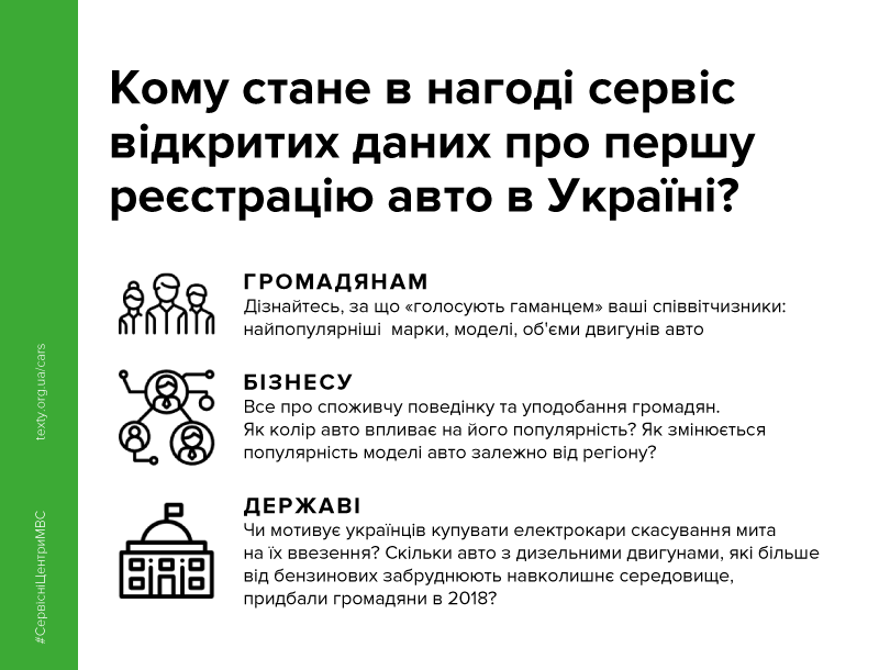 Сервіс на основі відкритих даних допоможе зрозуміти тенденції автомобільного ринку в Україні, запропонувати державі нові способи використання таких відкритих даних для підвищення доступності послуг у цій сфері, або ж виокремити цікаві факти. Окрім даних про реєстрацію легкових автомобілів, проект охоплює дані стосовно реєстрації транспортних засобів інших категорій, зокрема, автобусів та мікроавтобусів.