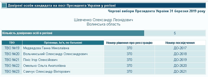 Кандидат Олександр Шевченко також зареєстрував представників у кожному із округів Волині. У постанові ЦВК № 370 від 22 лютого 2019 року йдеться, що довіреною особою в окрузі № 19 стала Ганна Медведєва, в окрузі № 20 – Олександр Вольчинський, в окрузі № 21 – Ігор Пініс, в окрузі № 22 – Ольга Омелько, в окрузі № 23 – Олександр Самчук. Галина Медведєва на місцевих виборах 2025 року балотувалася до Володимир-Волинської міської ради за списком «УКРОПУ», а Олександр Вольчинський у 2015 році став депутатом Горохівської районної ради, куди балотувався від «УКРОПУ». Ігор Пініс, у свою чергу, є депутатом Ковельської міськради та головою депутатської фракції Ковельська міська організація «УКРОПУ». Ольга Омелько працює старшим лаборантом відділу новацій та передових педагогічних технологій Волинського інституту післядипломної освіти. Олександр Самчук відомий на Волині як помічник-консультант нардепа Ірини Констанкевич.