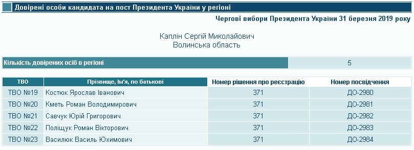 Відповідно до постанови № 371 від 22 лютого 2019 року, інтереси Сергія Капліна в окрузі № 19 представлятиме Ярослав Костюк, в окрузі № 20 – Роман Кметь, в окрузі № 21 – Юрій Савчук, в окрузі № 22 – Роман Поліщук, в окрузі № 23 – Василь Василюк. Ярослав Костюк є директором ТзОВ «Аграрно-виробничо-торгова фірма «Старк», а Роман Кметь очолював та був засновником ТзОВ «КРИСТАЛ – АГРО», яка перебуває у стані припинення. Повний тезка Юрія Савчука був керівником управління водопровідно-каналізаційного господарства міста Ковеля, а нині перебуває на пенсії. Роман Поліщук працює у комунальному закладі «Луцька гімназія № 18 Луцької міської ради», а повний тезка Василя Василюка на місцевих виборах 25 жовтня 2015 року балотувався до Камінь-Каширської міської ради від партії «Партіот».