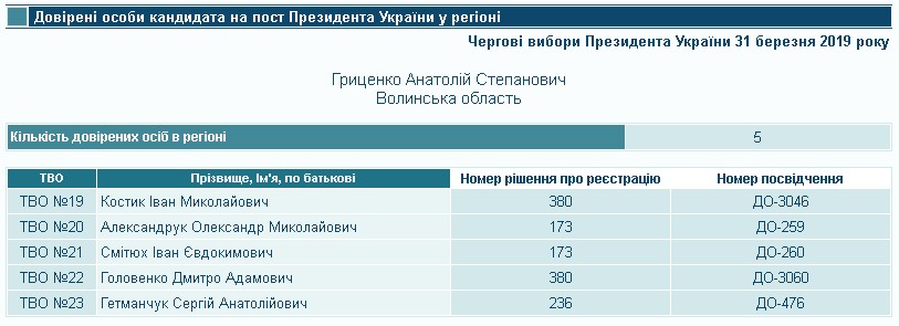 Відповідно до постанови № 380 від 25 лютого зі ще двома довіреними особами в межах волинських округів визначився й кандидат Анатолій Гриценко. Так, його інтереси в окрузі № 19 представлятиме Іван Костик, а у 22 – Дмитро Головенко. Іван Костик – пенсіонер, засновник організації роботодавців міста Нововолинськ, а Дмитро Головенко – керівник ОСББ Ветеранів, 22 у місті Луцьку.