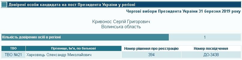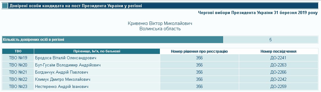 Відповідно до постанови ЦВК № 356 від 21 лютого 2019 року, кандидат Віктор Кривенко зареєстрував п’ять довірених осіб у межах волинських округів. Відтак, інтереси кандидата в окрузі № 19 представлятиме Віталій Бродоса, в окрузі № 20 – Володимир Бут-Гусаїм, в окрузі № 21 – Андрій Богданчук, в окрузі № 22 – Дмитро Климук, а в окрузі № 23 – Андрій Нестеренко. Віталій Бродоса є засновником та керівником товариства з обмеженою відповідальністю «Вітаб», основний вид діяльності якого – оптова торгівля зерном, необробленим тютюном, насінням і кормами для тварин. Володимир Бут-Гусаїм відомий на Волині громадський активіст, також він є засновником та керівником ГО «Сучасна Волинь». Андрій Богданчук очолює Турійську районну організацію «Народного Руху України», Дмитро Климук – керівник громадської організації «Центр юридичної допомоги», а особа з іменем і прізвищем Андрій Нестеренко є працівником товариства із обмеженою відповідальністю «Луцький хлібокомбінат».