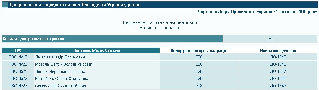 Згідно із постановою ЦВК № 328 від 16 лютого 2019 року кандидат Руслан Ригованов зареєстрував довірених осіб у всіх волинських округах. Так, в окрузі № 19 представляти свої інтереси він довірив Федору Дмітрієву, в окрузі № 20 — Віктору Мозолю, в окрузі № 21 – Мирославі Лисюк, окрузі № 22 – Олесі Матвійчук, а в окрузі № 23 – Юрію Семчуку. Федір Дмітрієв є пенсіонером, під час місцевих виборів 2017 року особа з іменем та прізвищем балотувалася до Зарічненської ОТГ шляхом самовисування та був обраний депутатом. Повний тезка Віктора Мозоля певний час був директором магазину «Нова лінія» у Луцьку. Повна тезка Олесі Матвійчук є діловодом Волинській обласній організації Радикальної партії Олега Ляшка на Волині, а повний тезка Юрія Семчука на сайті волинського осередку партії вказаний як «координатор округів». Жодних даних, які б дозволили асоціювати Мирославу Лисюк з Волинською областю, знайти не вдалося.