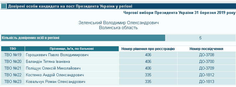 Кандидат Володимир Зеленський у межах волинських округів найперше визначився із довіреними особами в округах № 22 та № 23. Так, в 22-ому окрузі його представником став Андрій Костенко, а в 23-ому – Роман Ковальчук. Андрій Костенко є співвласником громадської організації «Волинський актив молоді», директором якої, у свою чергу, є представник «Зе!команди» у Волинській області Валерій Стернійук. Роман Ковальчук очолює ГО «Спортивний клуб козацьких бойових мистецтв «Герць», зареєстровану у Луцьку. Відповідно до постанови № 406 від 28 лютого, кандидат визначився і з представниками в інших округах. В окрузі № 19 його представлятиме Павло Горошкевич, в окрузі № 20 – Тетяна Баландін, в окрузі № 21 — Олексій Поліщук. Тетяна Баландін є співзасновницею ГО «Центр жіночих ініціатив «Марія», яка зареєстрована у місті Горохів. Даних про Павла Горошкевича, окрім того, що він мешкає у Володимирі-Волинському, знайти не вдалося, як і інформації, яка б дозволила асоціювати із Волинню Олексія Поліщука.