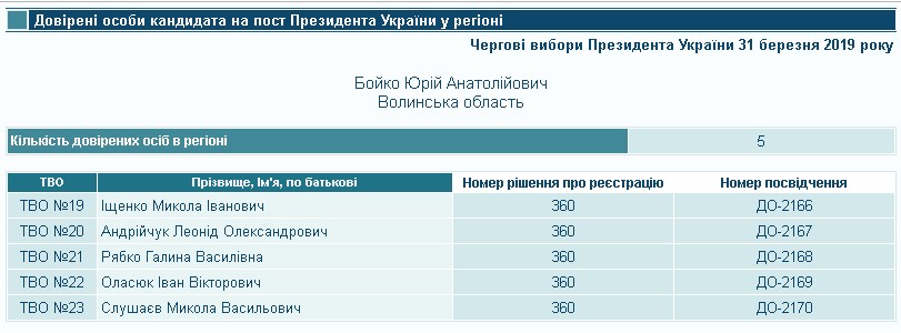 Кандидат Юрій Бойко також зареєстрував довірених осіб у кожному із волинських округів. Так, згідно із постановою № 360 від 21 лютого 2019 року, його довіреною особою в окрузі № 19 став Микола Іщенко, в окрузі № 20 – Леонід Андрійчук, в окрузі № 21 — Галина Рябко, в окрузі № 22 – Іван Оласюк, в окрузі № 23 – Микола Слушаєв. Микола Іщенко є працівником ПрАТ «УСК «Княжа», повний тезка Леоніда Андрійчука раніше займав пост голови Горохівської РДА, а повна тезка Галини Рябко була головою Ковельської районної організації «Партії Регіонів». Повний тезка Миколи Слушаєва балотувався до Ківерцівської районної ради на чергових місцевих виборах 25 жовтня 2015 року від «УКРОПУ».