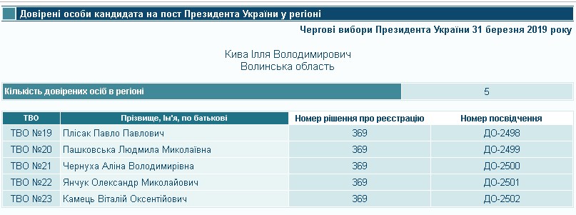 Згідно із постановою № 369 від 22 лютого 2019 року, кандидат Ілля Кива зареєстрував на Волині п’ятьох довірених осіб. Інтереси кандидата в окрузі № 19 представлятиме Павло Плісак, в окрузі № 20 – Людмила Пашковська, в окрузі № 21 – Аліна Чернуха, в окрузі № 22 – Олександр Янчук, в окрузі № 23 – Віталій Камець. Повний тезка Павла Плісака є працівником компанії «Пасме-Пластік», основним видом діяльності якого є виробництво будівельних виробів із пластмас. Людмила Пашковська зазначена як керівник Камінь-Каширської районної організації Соціалістичної партії України. Аліна Чернуха є керівником ратнівської районної організації партії та працює лікарем у Ратнівській ЦРЛ. Особа з прізвищем та іменем Олександр Янчук є працівником у фізичної особи-підприємця, а Віталій Камець очолює ТзОВ «СКВ Волинь-Сервіс», основним видом діяльності якого є ремонт і технічне обслуговування машин і устаткування промислового призначення.