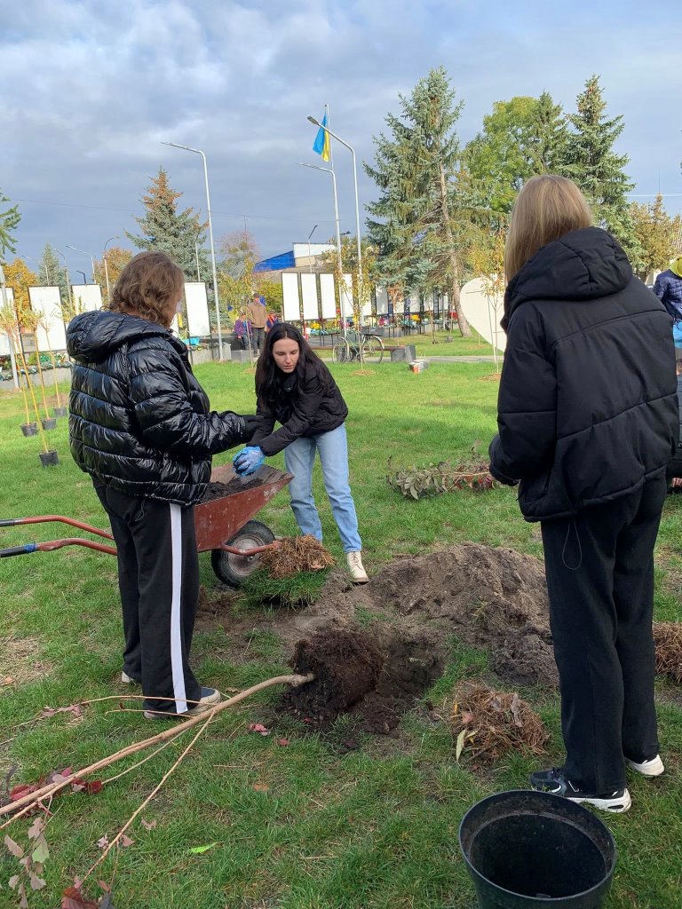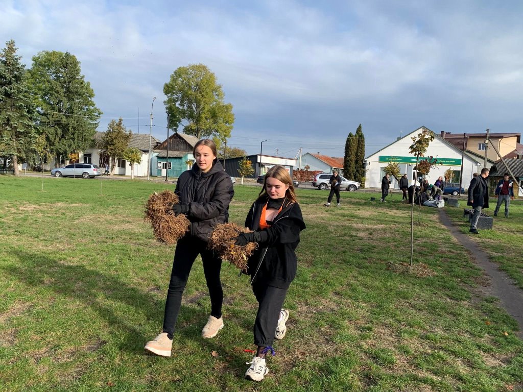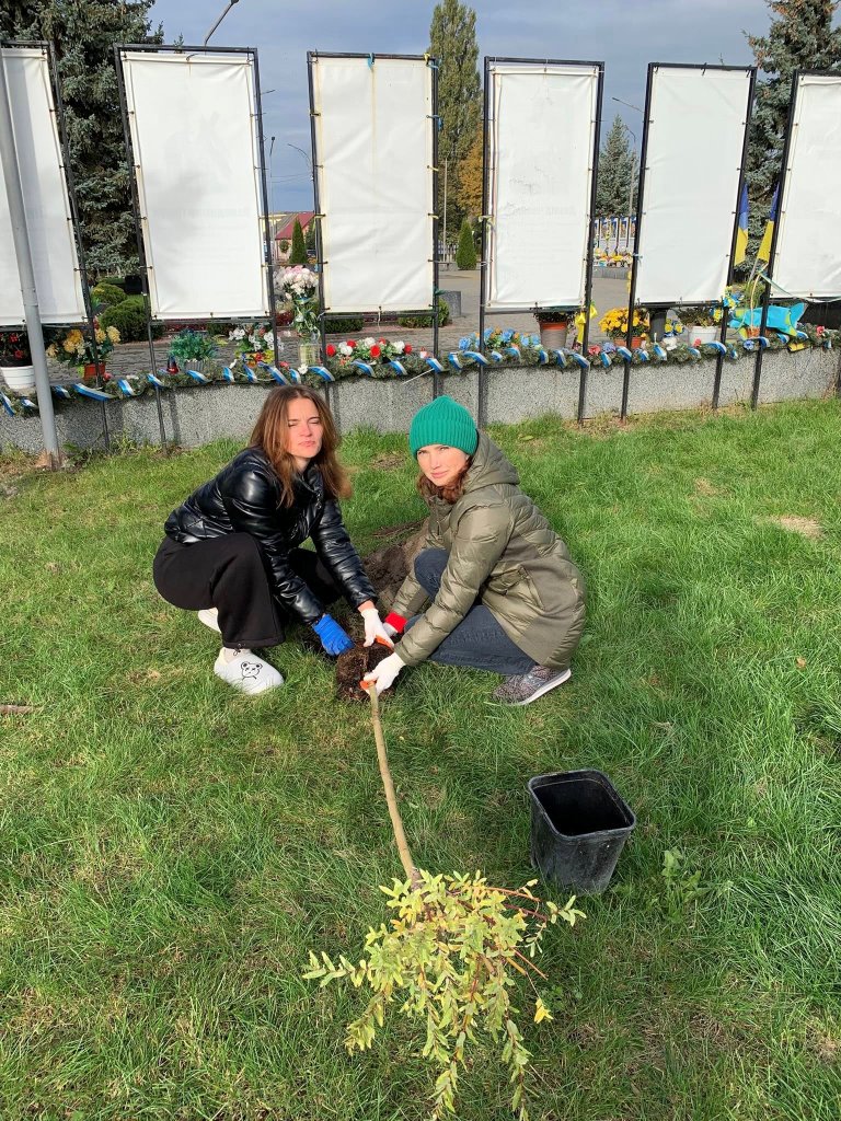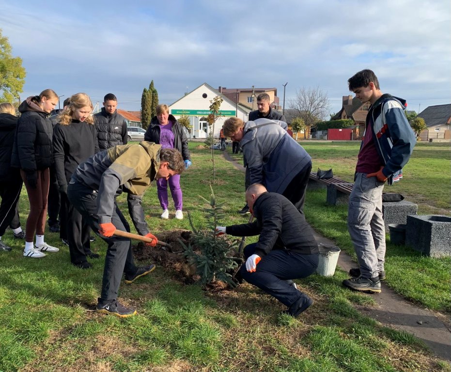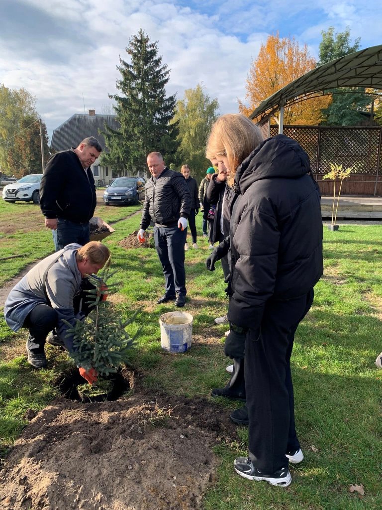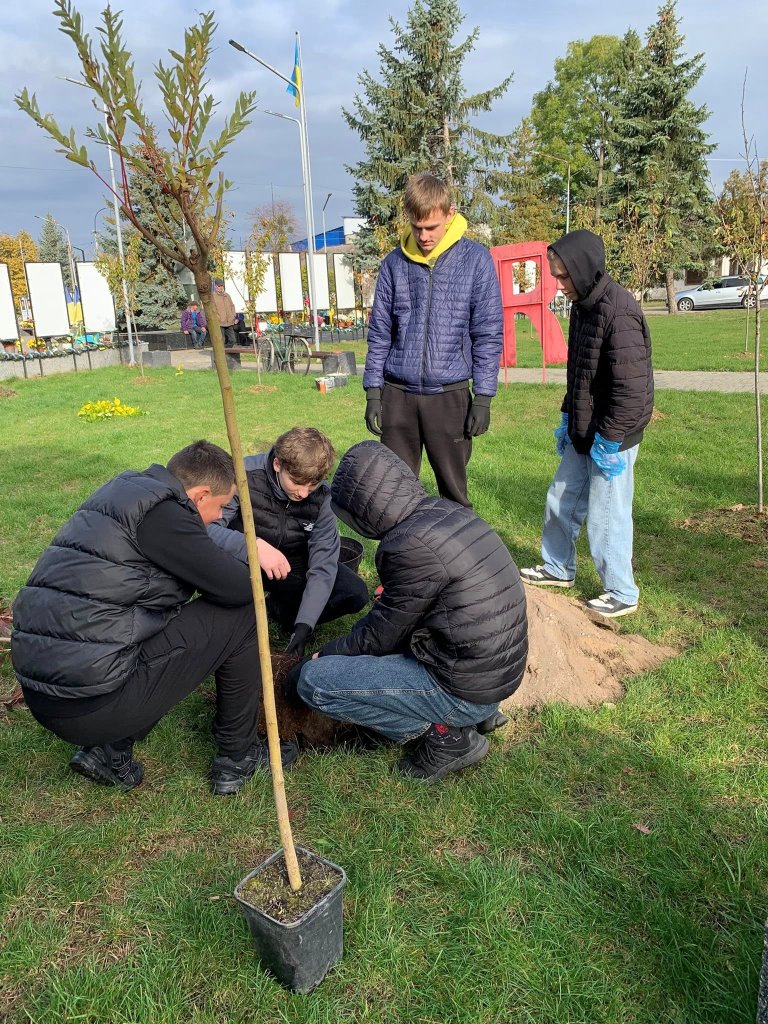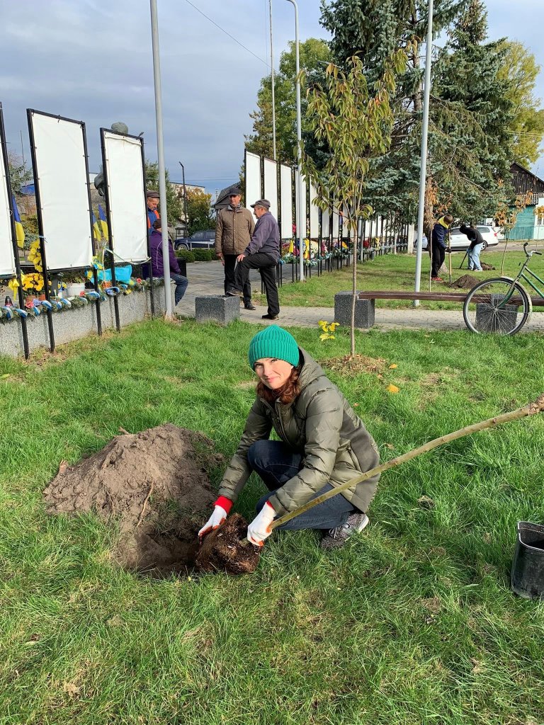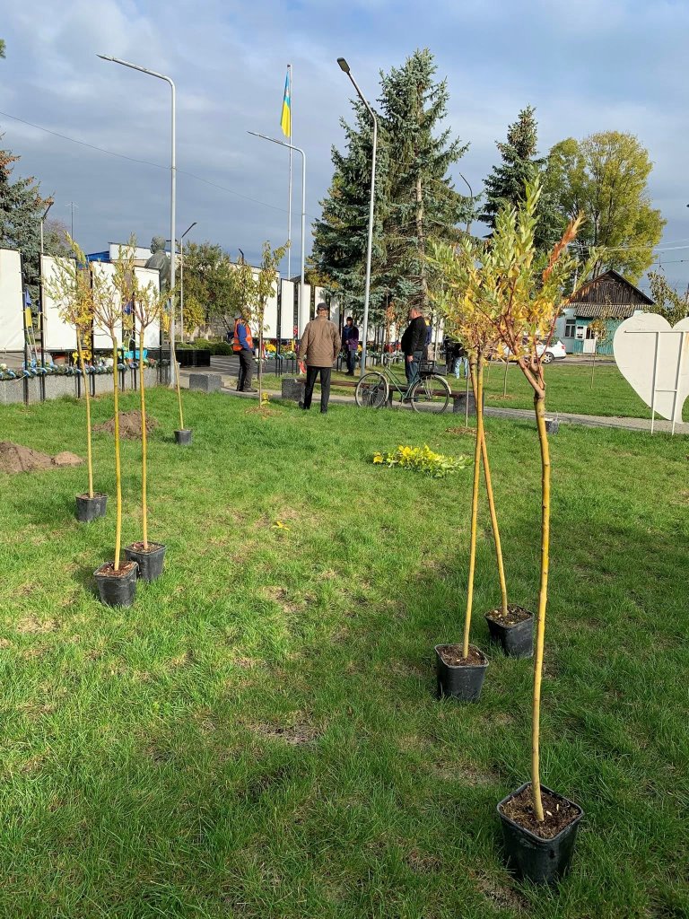 За ці кошти закупили 22 саджанці, серед яких – ялини, сакури, штамбові верби. Сьогодні дерева висадили в селищному сквері та біля пам’ятника землякам.
