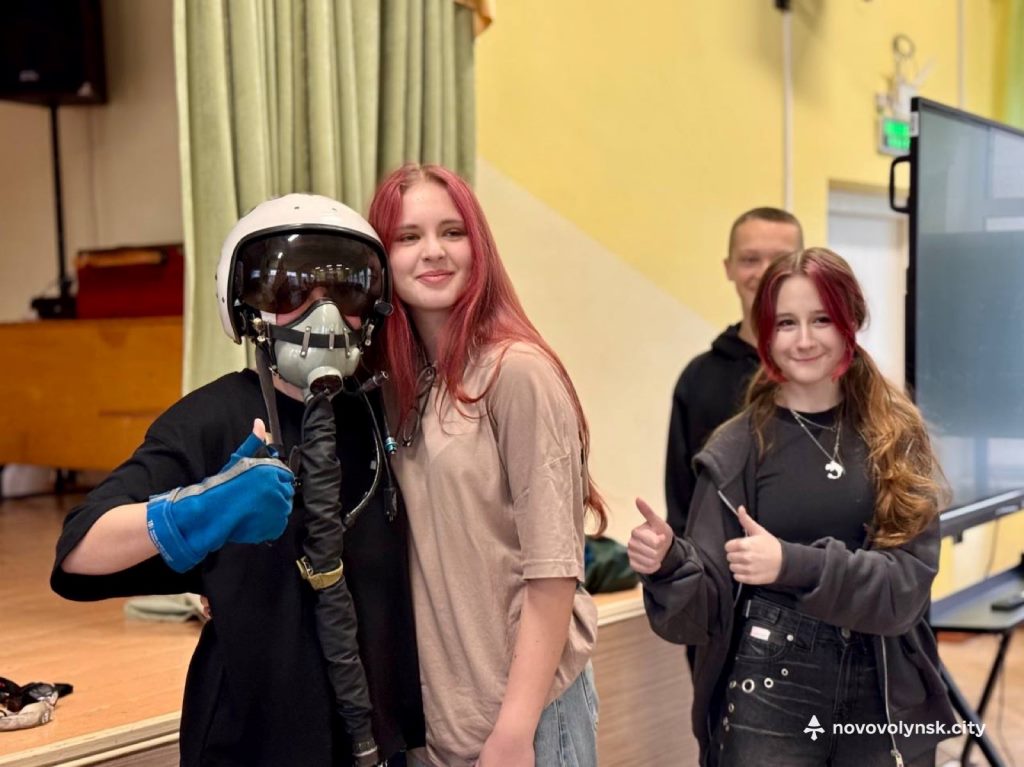 Захисники неба подякували учням та вчителям за небайдужість і підтримку. Представник льотного складу розповів про службу в авіації та поділився цікавими історіями про захист повітряного простору України. Усі охочі школярі могли приміряти форму льотчика.