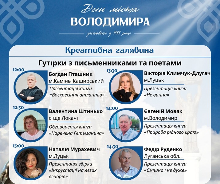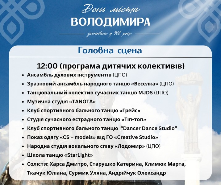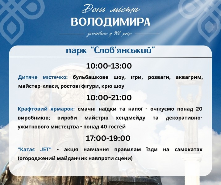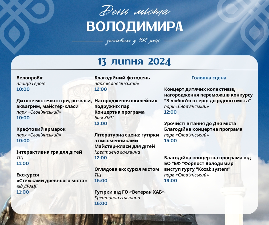 13 липня у Володимирі відбудеться низка благодійних та урочистих заходів з нагоди Дня міста. Організатори нагадують, які саме події, де та о котрій годині чекатимуть на вдячних глядачів. З афішами заходів можете ознайомитися нижче.