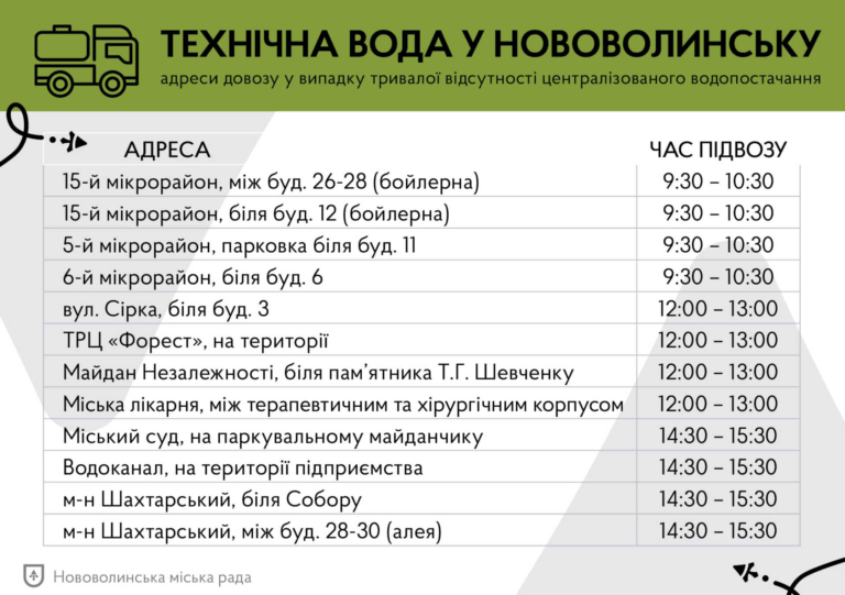 Якщо водопостачання в оселях нововолинців не буде більш тривалий час, КП «Нововолинськводоканал» довозитиме технічну воду за адресами та у час, вказаний в інфографіці.